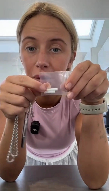Dévisser Calm30 → insérer le noyau parfumé → revisser. Inspirez par le nez, expirez lentement 3–6 s dans Calm30 (silencieux). Refermez le capuchon ensuite.