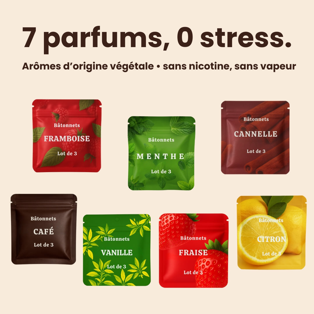 Choisissez votre parfum. Une touche d’arôme végétal léger qui rend l’expiration plus agréable et favorise le calme en 3 souffles — jusqu’à 30 jours par bâtonnets (≥ 12 ans, non alimentaire).